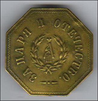 На бляхе правильной восьмиугольной формы размером в 1 вершок (44,4 мм). помещен вензель Александра III, выполненный вязью и обрамленный лавровым венком, а также надпись "3a царя и отечество"."Бляха для нехристиан" предназначалась для ратников-ополченцев не православного вероисповедания.