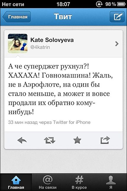Lenta.ru уточняет, что 9 мая после сообщений об авиакатастрофе SSJ-100 пользователь Твиттера 4katrin (Kate Solovyeva) написала: "А че суперджет рухнул?! Хахаха! Говномашина! Жаль не в Аэрофлоте, на один бы стало меньше, а может и вовсе продали их обратно кому-нибудь". Твит вызвал возмущение других пользователей сервиса микроблогов. По страницам в социальных сетях Facebook и "Вконтакте", которые были привязаны к аккаунту 4katrin, удалось установить, что автор сообщения является стюардессой "Аэрофлота" Екатериной Соловьевой.