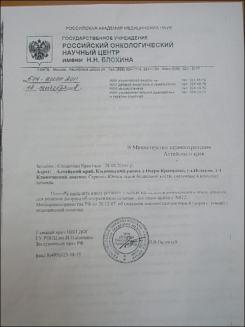 Еще одна маленькая жительница Алтайского края, больная раком, нуждается помощи ... ... У 4-летней жительницы Барнаула КристиныСолдатовой саркома Юинга левой бедренной кости. Заболевание было выявлено в октябре прошлого года.