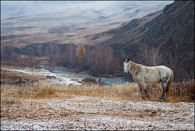 "Вообще-то я намеревался сфотографировать рыжего коня, но он позировать не собирался: я так и не смог дождаться, когда он соизволит поднять голову. И тут белая лошадь словно вплывает в "кадр" и поворачивается на меня", - отмечает Евгений.