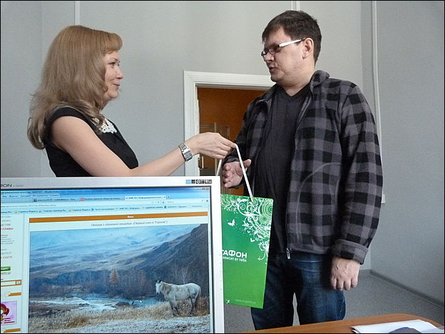 Сотрудник компании "Мегафон" Елена Погодаева вручила гостям заслуженные призы - МегаФон SP-A20i Mint - смартфон с поддержкой технологии Intel Wireless Display и подарочный набор: наушники, компьютерную мышь, usb-флешку.