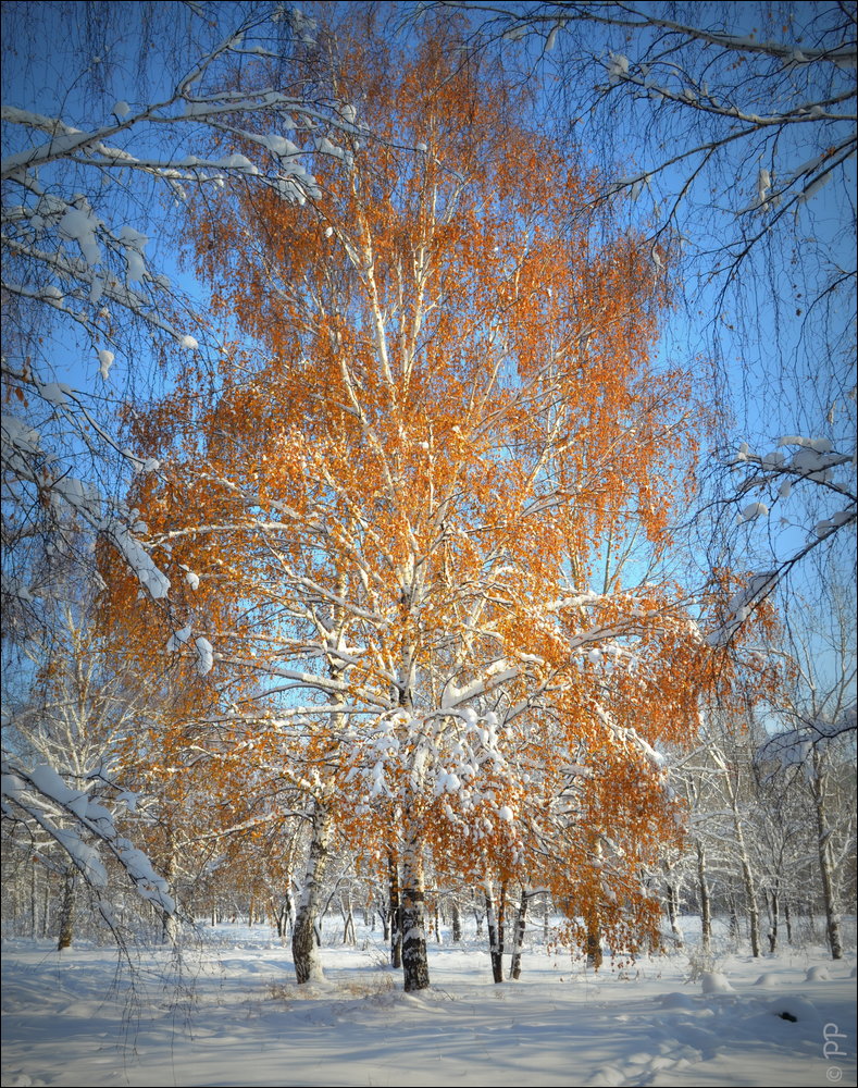 "Суровая сибирская осень" - ничего "сурового" на фото нет, отличный осенний солнечный денёк, центральное расположение кадра, смотрится не плохо, отличный контраст рыжего на голубом небе, НО зачем автор применил виньетирование???? тем самым убив фотографию...