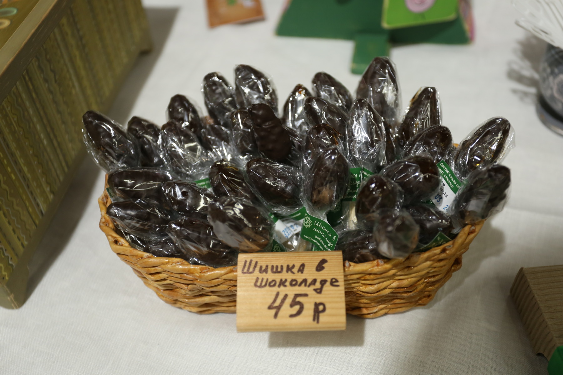 На выставке были представлены так называемые шишки в шоколаде. Авторы Дмитрий и Татьяна выиграли с этим сувениром на Всероссийском фестивале-конкурсе "Туристический сувенир" 2017 года, который проходил в Кирове.