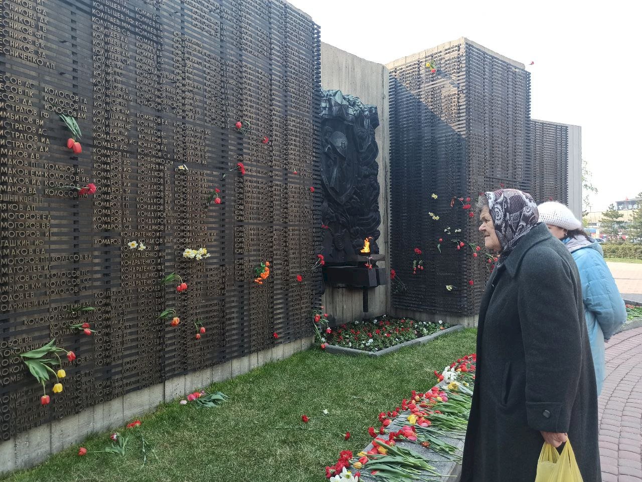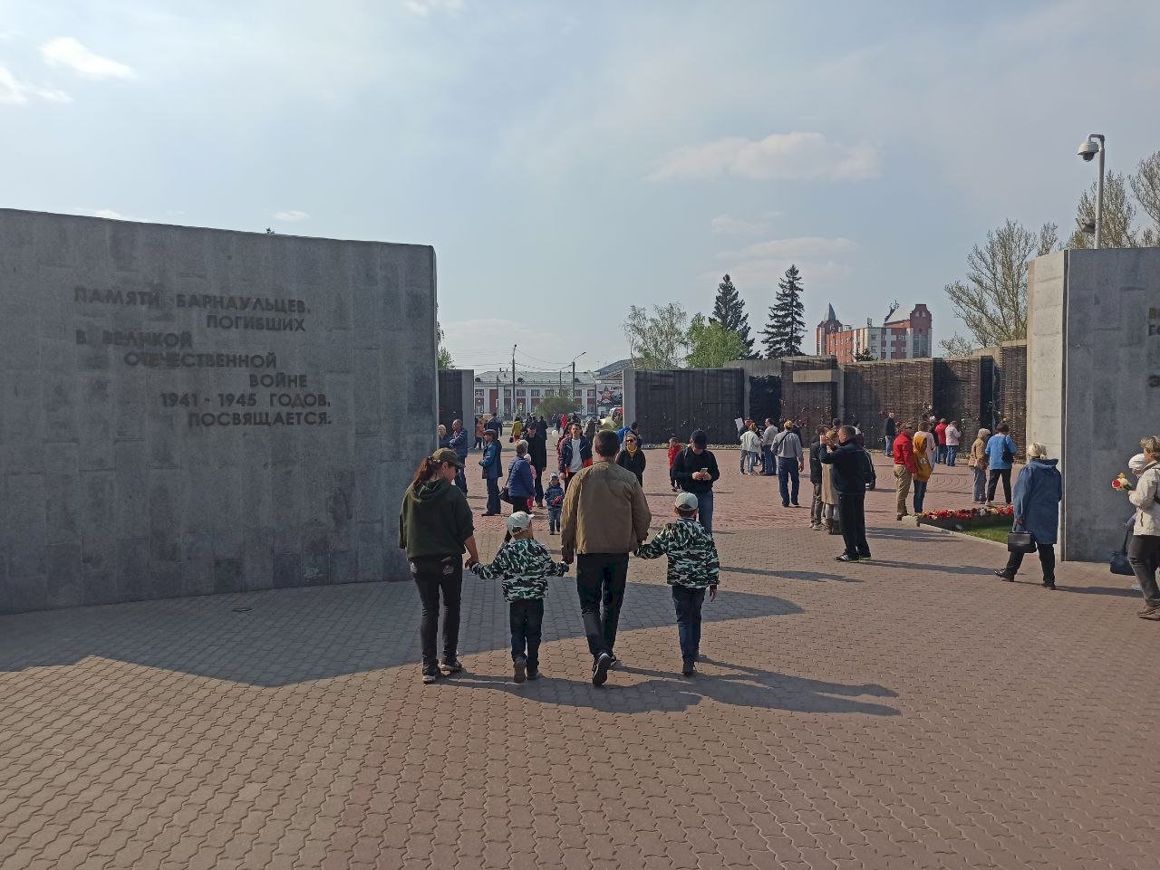 16:23 — Много людей идут к Мемориалу 9 мая. По пути взрослые что-то объясняют детям, а малыши внимательно слушают рассказы родителей