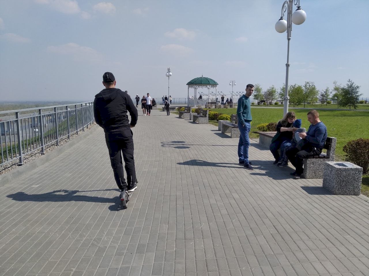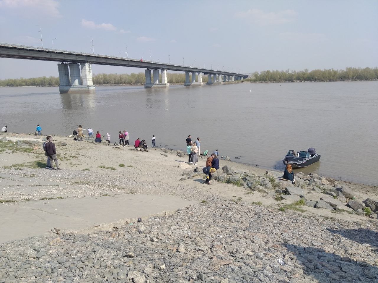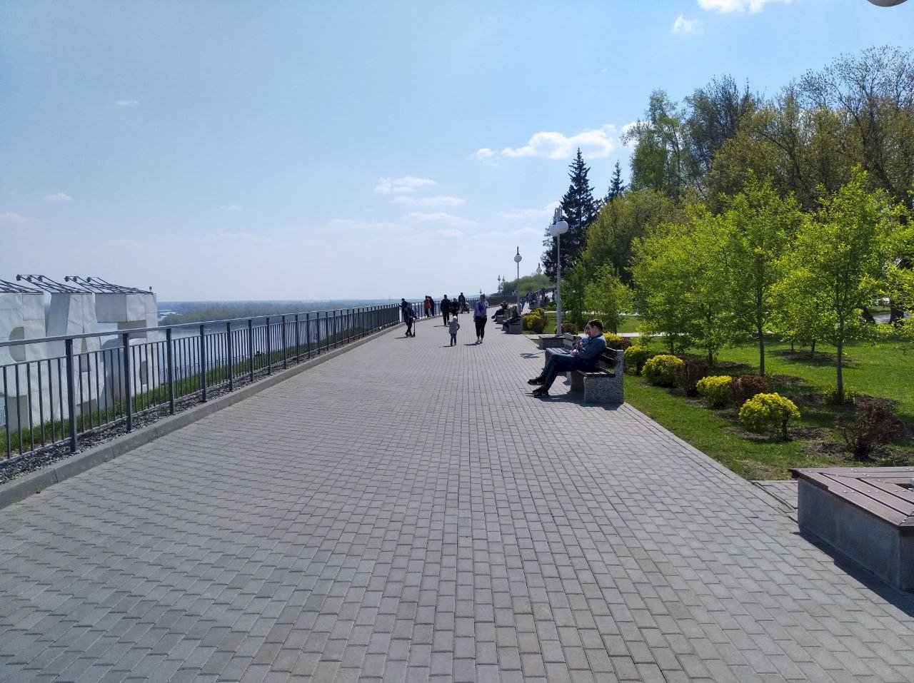 15:42 — На набережной каждый находит занятие себе по душе. Кто-то слушает праздничный концерт, кто-то просто прогуливается и катает детей на машинках, а те, кому совсем скучно наблюдать за праздничной программой, могут спуститься к реке и покидать камни в воду.