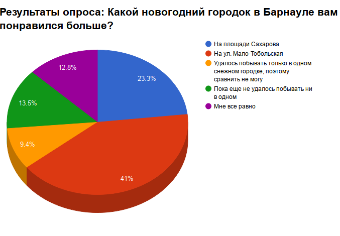Напомним, в январе портал Amic.ru проводил опрос "Какой снежный городок вам понравился больше". Тогда читатели сайта проголосовали за городок на улице Мало-Тобольской. Всего в опросе приняли 287 читателей портала. При этом 118 из них выбрали ответ "на улице Мало-Тобольской". За площадь Сахарова проголосовали 67 человек.