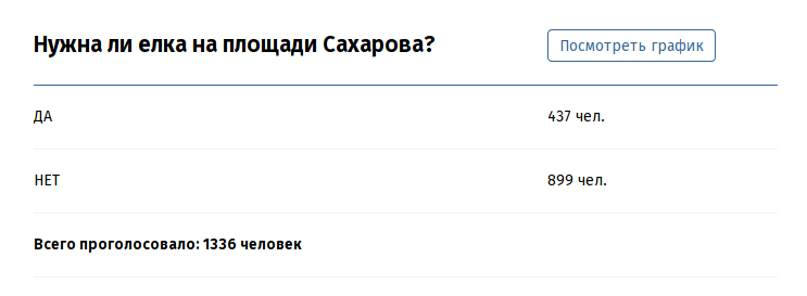 Кстати, в другом опросе "Нужна ли елка на площади Сахарова" большинство из принявших участие в голосовании читателей портала Amic.ru высказались за вариант "нет" (899 человек).