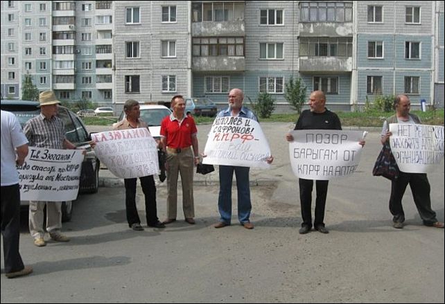 Свое возмущение и претензии они выразили в лозугах: "Заполев и Сафронов, КПРФ не ваш бизнес", "Позор барыгам от КПРФ на Алтае", "Нет рейдерскому захвату алтайской организации коммунистов", "Товарищ Зюганов, нужно спасать Барнаул от Мастинина и купленных "коммунистов"".