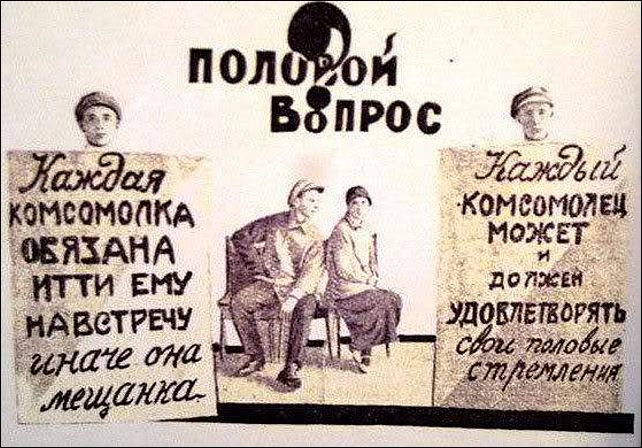 Анонимный автор, обращаясь в редакцию газеты "Правда", писал: "Как же нам удовлетворять естественные надобности? Девушки должны были пойти навстречу просьбе товарищей-комсомольцев и снять с них сексуальное напряжение, чтобы они, вдохновленные и довольные, смело шли к новым трудовым победам! Эрос революции должен помогать молодежи строить светлое коммунистическое завтра!"