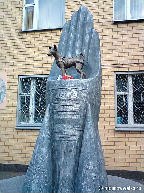 Памятник Лайке, 50 лет назад погибшей на орбите. Надпись на ракете: "Пионерам прорыва человечества в космос…" Размер - 3м 85см, вес - 1,8 тонны, материал - чугун, собачка из бронзы. Концепция: Скульптура Лайки в натуральную величину установлена на основании, представляющим собой модель средней части ракеты "ВОСТОК";(масштаб 1:3,5), срезанной таким образом, чтобы предстать в форме руки, выносящей собачку в космос. 4 элемента первой ступени ракеты олицетворяют мышцы руки. Именно такая конструкция первой ступени определила приоритет советской космонавтики.