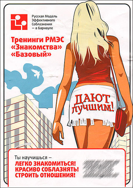 Уже рядом со своим, находящимся по соседству подъездом, обнаруживаю аналогичное рекламное объявление. В нем сказано, что организация под названием "Русская модель эффективного соблазнения" приглашает жителей Барнаула на тренинги "Знакомства" и "Базовый". Своих клиентов организация обещает научить "легко знакомиться", "красиво соблазнять" и "строить отношения". Предполагаю, что если в очер