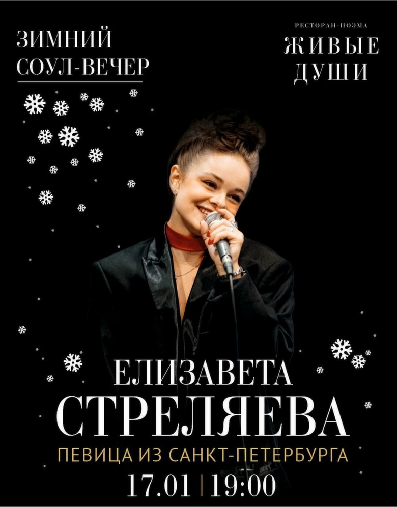 17 января 2026 года ресторан-поэма "Живые души" приглашает барнаульцев в 19:00 на зимний соул-вечер с участием юной джазовой певицы из Северной столицы – Елизаветы Стреляевой. Гостей ждет путешествие, где звучат истории, а еда и искусство гармонично сплетаются воедино. Каждый из музыкантов здесь привносит через творчество яркую мозаику культур и идей.