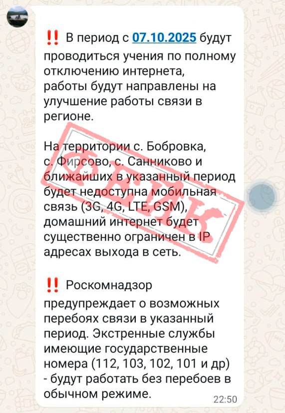 «Бобровка, Фирсово и Санниково останутся 7 октября без мобильной связи из-за учений по полному отключению интернета», – отмечается в ложной информации.