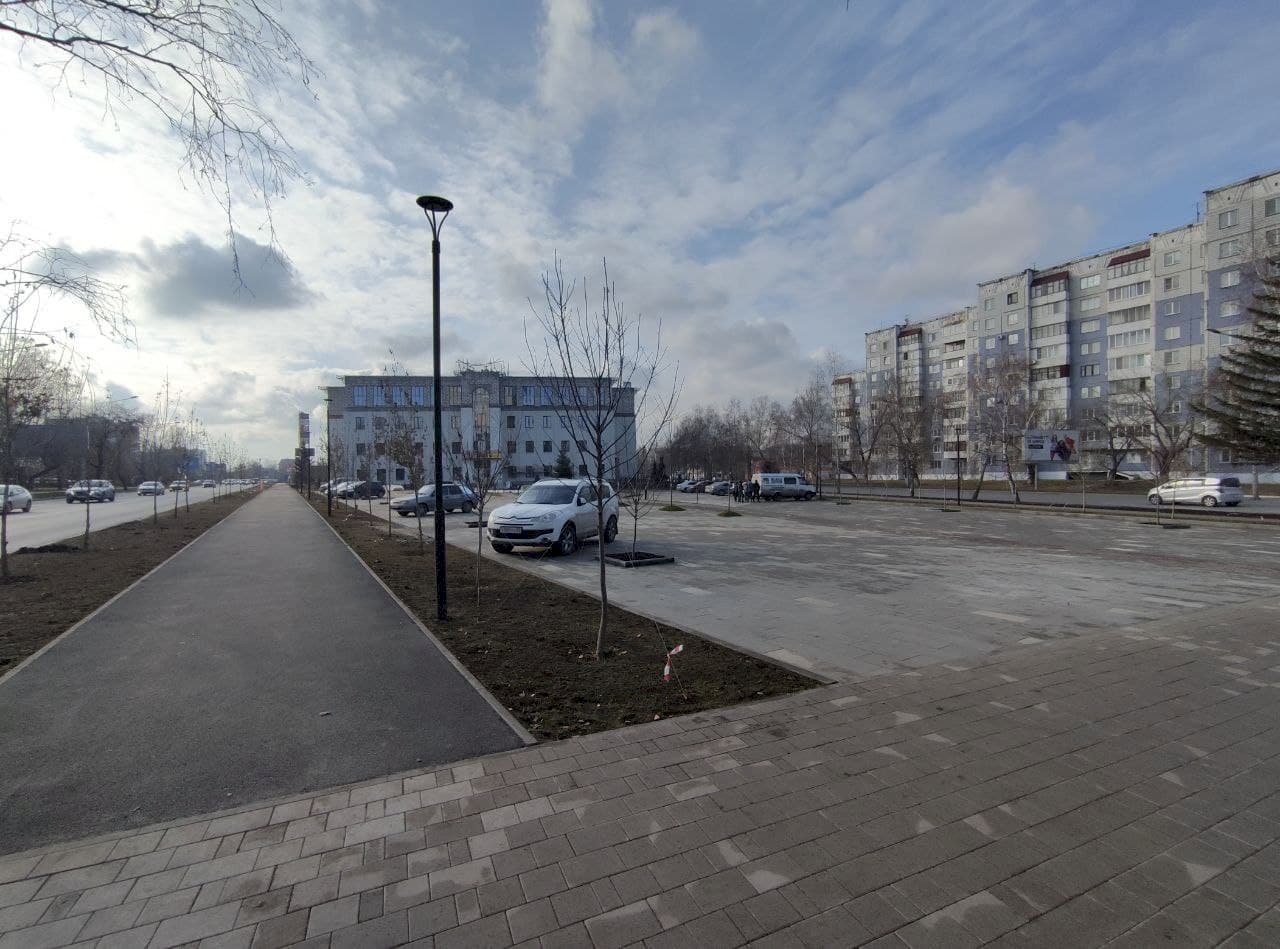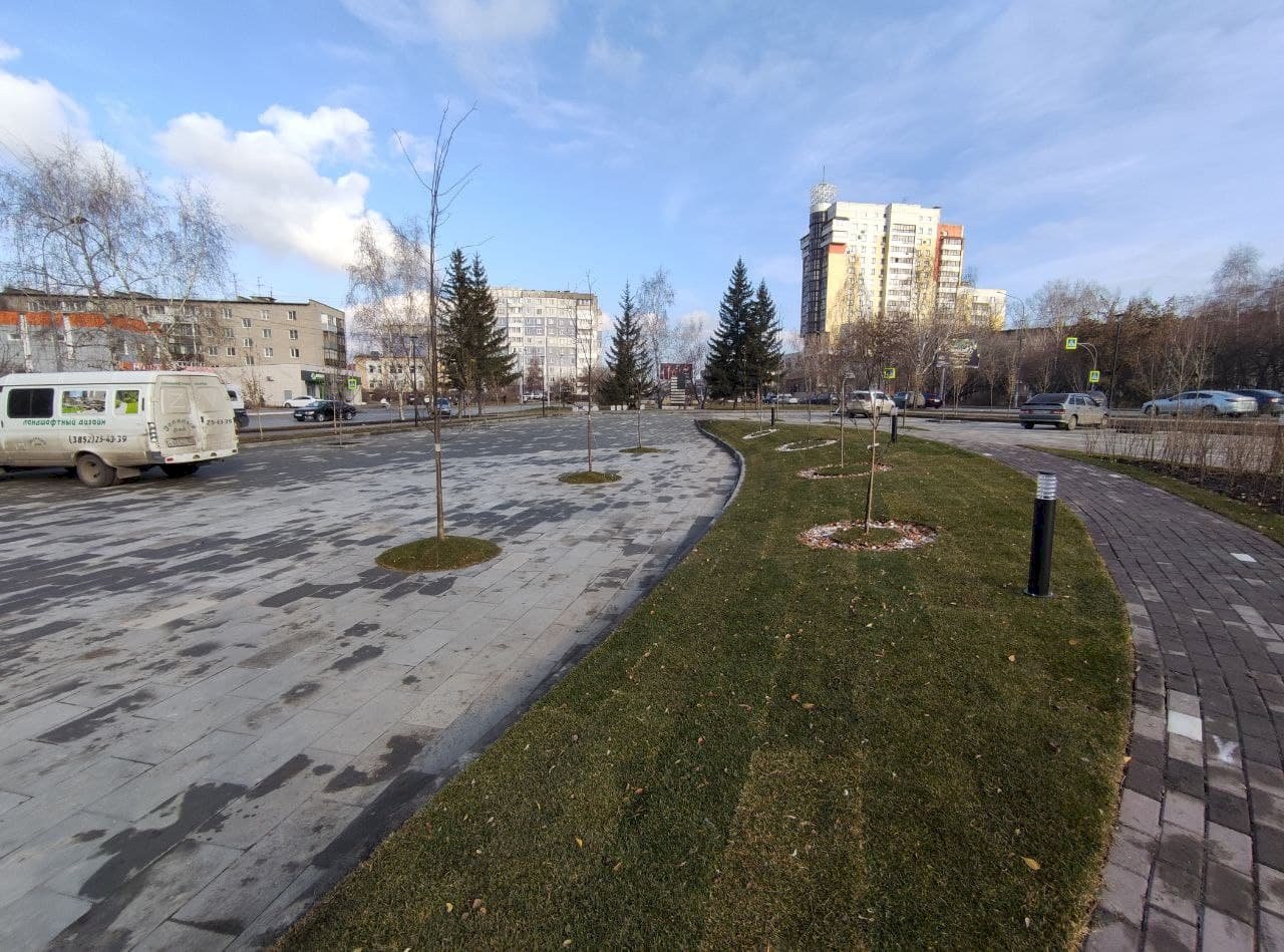 Благоустройство сквера на проспекте Строителей в Барнауле (перед ТЦ Galaxy) постепенно приближается к финалу. Рабочие уже положили плитку и асфальт, посадили новые деревья и посеяли газоны, а также сделали освещение.