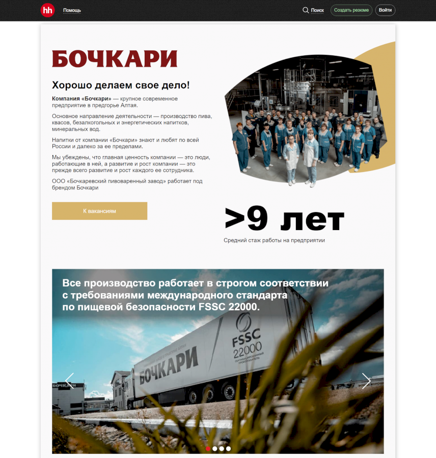 Так, уже около года Бочкарёвский пивоваренный завод использует брендирование вакансий. Недавно сделали и брендированную страницу компании на сайте по поиску работы и сотрудников hh.ru. При её оформлении учли сформированный EVP для соискателей, то есть ценностное предложение работодателя — те преимущества, ради которых сотрудники приходят в компанию и остаются работать в ней.