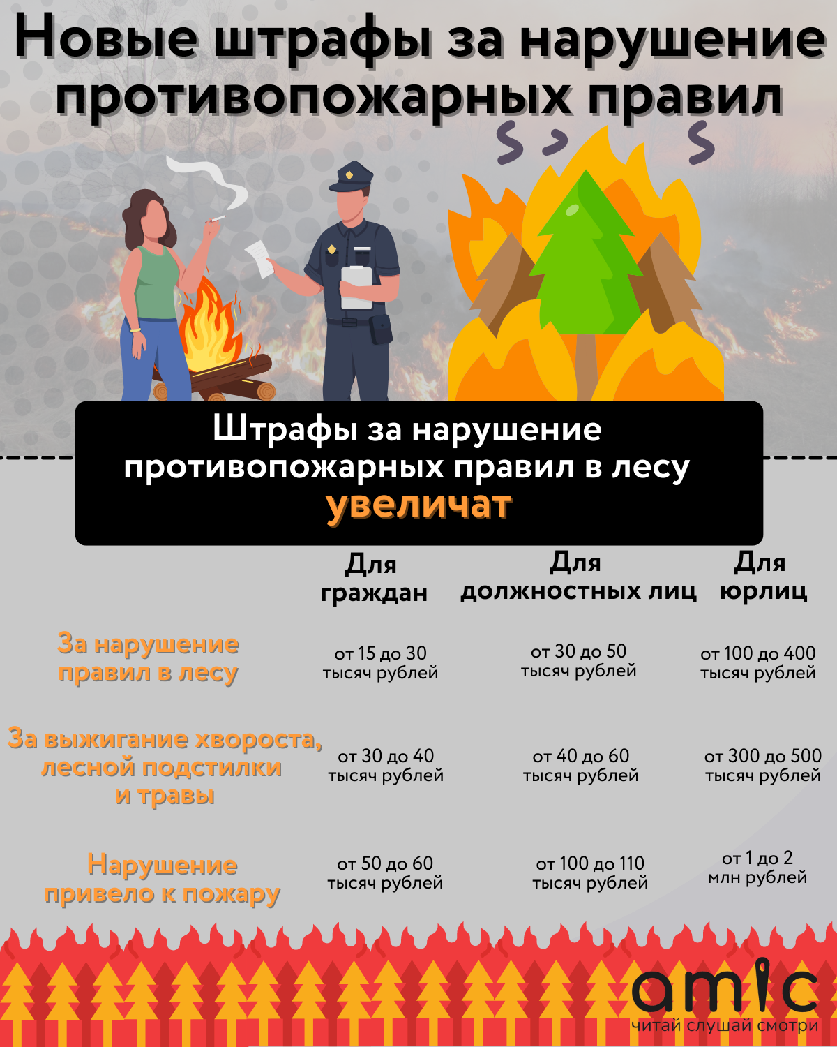 Конечно, самыми суровыми будут наказания за нарушения, которые повлекли за собой возникновение лесного пожара. За это граждан будут штрафовать на сумму от 50 до 60 тысяч рублей, должностных лиц — от 100 до 110 тысяч рублей, а юрлиц — от 1 млн до 2 млн рублей.