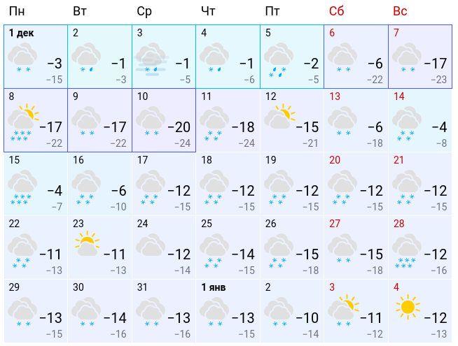 Кстати, почти всю вторую половину декабря в Алтайском крае будут идти снегопады, а в первую неделю ожидаются дожди и мокрый снег, после чего придет резкое похолодание. Об этом говорится в прогнозе Gismeteo.