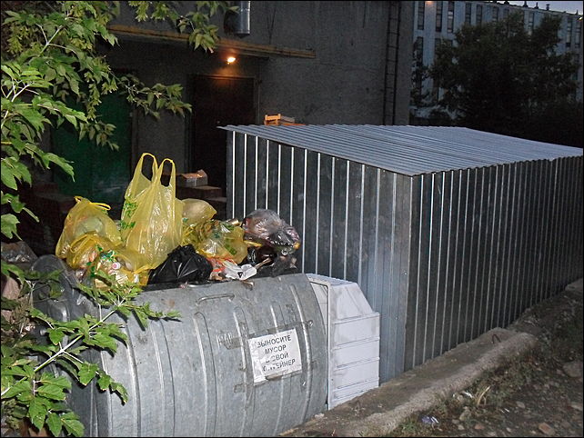Магазин "Мария-Ра" открылся года 1,5 назад. Практически сразу же граждане, живущие в окрестных домах, стали выносить бытовые отходы в мусорный контейнер, установленный у магазина. Обвинить в этом горожан, проживающих в многоэтажке на пр. Строителей, 41, нельзя, поскольку с контейнерами и вывозом мусора у данного дома все порядке. Видимо, отходы несут из окрестных "хрущевок".