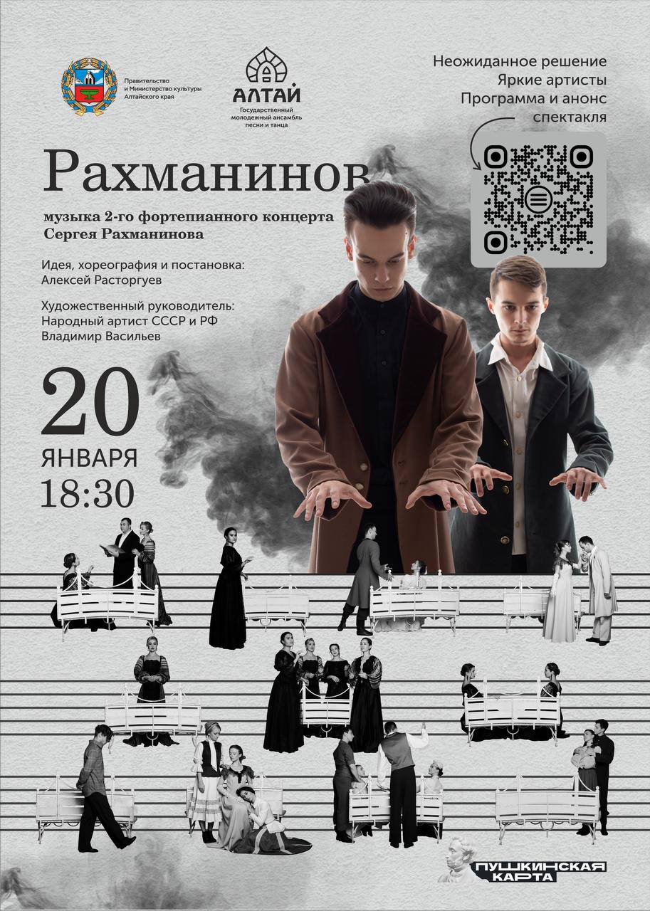 Спектакль "Рахманинов" в исполнении Государственного ансамбля песни и танца "Алтай" им. А. Ф. Березикова покажут в Барнауле в концертном зале "Сибирь". Зрителям представят балет с театральным сюжетом под Второй фортепианный концерт Рахманинова. По словам известного балетмейстера Владимира Васильева, "Алтай" стал первым ансамблем, где музыка известного композитора прозвучала в таком формате.