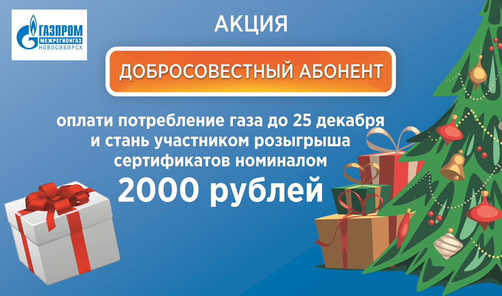 «Газпром межрегионгаз Новосибирск» проводит предновогоднюю акцию среди добросовестных абонентов. Все, кто до 25 декабря 2022 года оплатит текущее потребление газа и долги, автоматически станут участниками. Среди них разыграют более 200 сертификатов номиналом 2000 рублей в сетевой супермаркет.