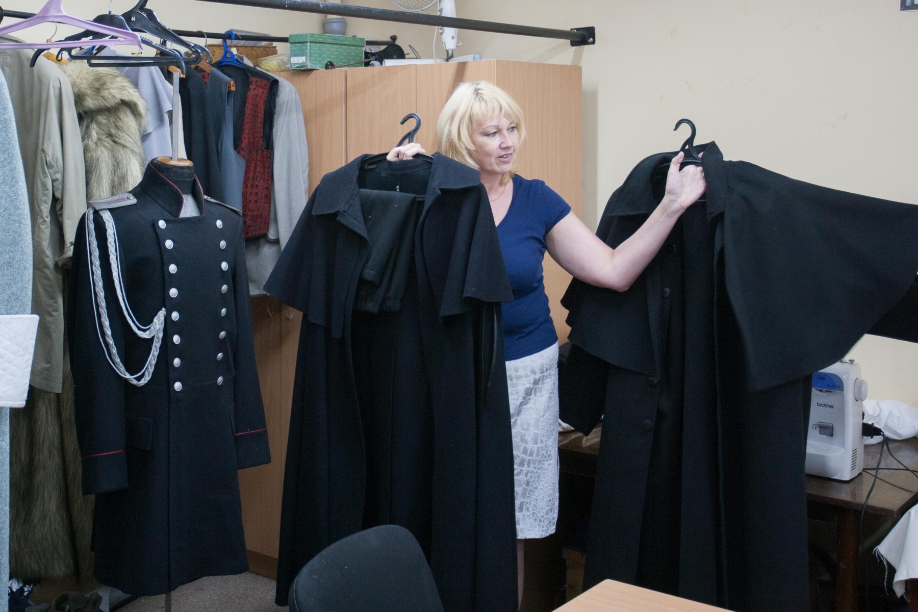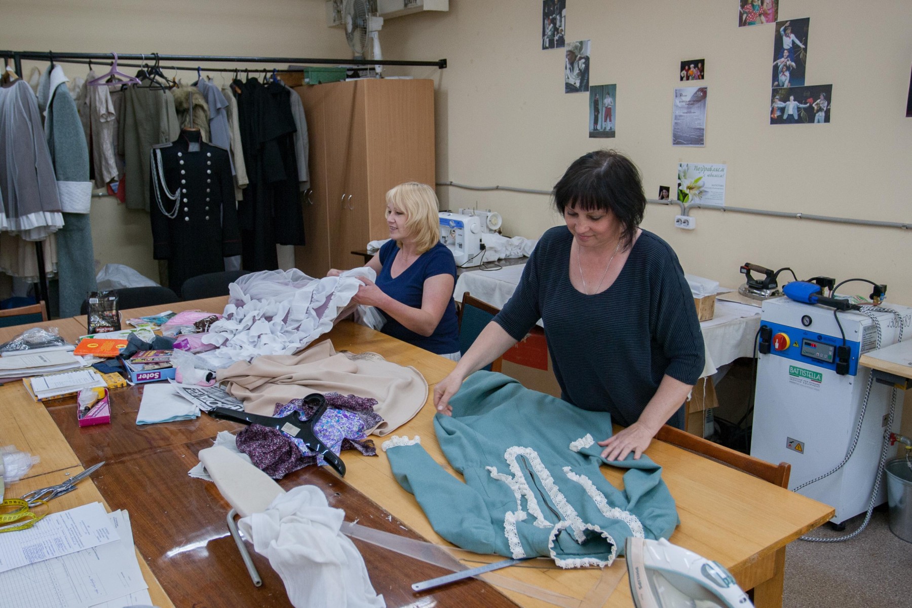 Пошивка — самый светлый цех в театре, кроме того, здесь никогда не выключают музыку. Иногда слушают вживую, когда кто-то из труппы репетирует песни в гримерке. Мастерицы, по их признанию, очень любят своих артистов, поэтому стены кабинета украшены их многочисленными фотографиями.Самым сложным называют спектакль "Без вины виноватые", над которым работала художница из Санкт-Петербурга Ника Велегжанинова.
