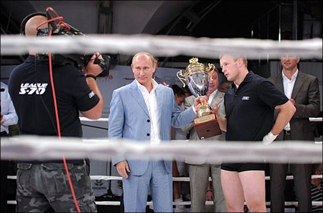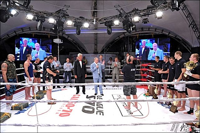 Перед началом боев гостям решили напомнить, чем знаменит Владимир Путин и показали видеоролик о нем.