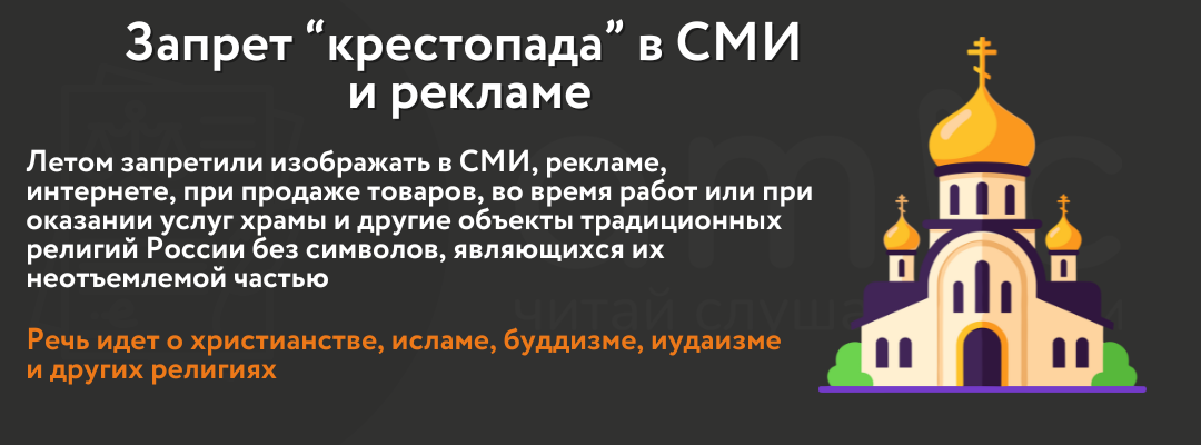 15 июля 2025 года депутаты Госдумы приняли закон, защищающий религиозные символы основных традиционных вероисповеданий. А именно в стране запретили изображать в СМИ, рекламе, интернете, при продаже товаров, во время работ или при оказании услуг храмы и другие объекты традиционных религий России (христианства, ислама, буддизма, иудаизма и других) без символов, являющихся их неотъемлемой частью.