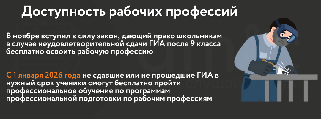В ноябре 2025 года Госдума приняла законопроект, который позволит школьникам в случае неудовлетворительной сдачи ГИА после девятого класса бесплатно освоить рабочую профессию и подготовиться к пересдаче экзамена. С 1 января 2026 года не сдавшие или не прошедшие ГИА в нужный срок ученики смогут бесплатно пройти профессиональное обучение по программам профессиональной подготовки по рабочим профессиям.
