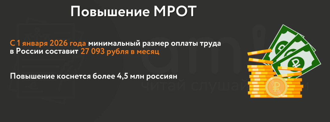 В ноябре 2025 года Госдума повысила минимальный размер оплаты труда (МРОТ). С 1 января 2026 года он составит 27 093 рубля в месяц и вырастет более чем на 20%. Таким образом, зарплата должна увеличиться у 4,5 млн человек, сообщают на сайте Госдумы.