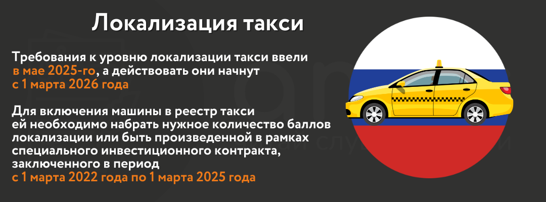 В мае 2025 года Госдума установила требования к уровню локализации такси, которые начнут действовать с 1 марта 2026 года. А именно для включения автомобиля в реестр такси машине необходимо набрать нужное количество баллов локализации либо же автомобиль должен быть произведен в рамках специального инвестиционного контракта, заключенного в период с 1 марта 2022 года по 1 марта 2025 года.