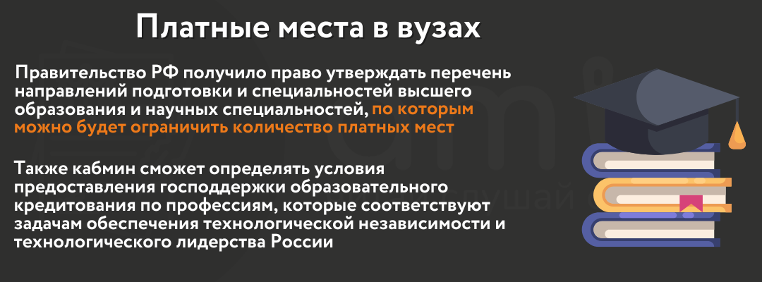В мае 2025 года Госдума приняла закон о регулировании объемов платного обучения в вузах. По закону с 1 сентября 2025 года правительство РФ наделили полномочиями утверждать перечень направлений подготовки и специальностей высшего образования и научных специальностей, по которым будет определяться предельное число платных мест в вузах.