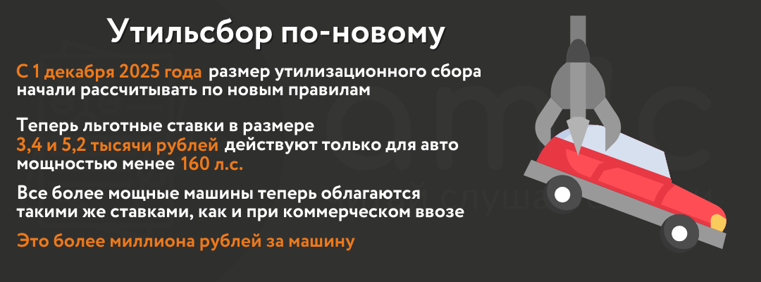 В 2025 году российское правительство изменило порядок исчисления утилизационного сбора, постановление вступило в силу 1 декабря 2025 года. Новые правила отменили льготный утильсбор на машины с двигателями мощнее 160 л.с., ввозимые гражданами для личного пользования. Ранее за новое авто в возрасте до трех лет нужно было заплатить 3,4 тысячи рублей, а за авто старше трех лет – 5,2 тысячи рублей.