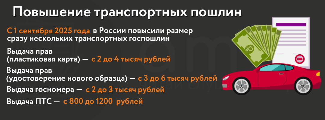 В июле 2025 года российская Госдума приняла закон о повышении с 1 сентября 2025 года пошлин за государственную регистрацию транспортных средств, выдачу водительских удостоверений, техосмотр и другие действия, связанные с транспортом. По закону госпошлины за выдачу водительских прав повысились в два раза. Например, цена за пластиковую карту выросла с двух до четырех тысяч рублей, а за удостоверение нового образца – с трех до шести тысяч рублей.