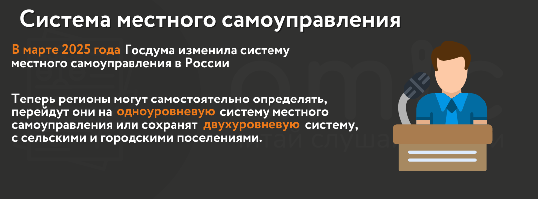 В марте 2025 года Госдума приняла закон "Об общих принципах организации местного самоуправления в единой системе публичной власти", который изменил систему местного самоуправления в России. Закон разрешил регионам самостоятельно определять, перейдут они на одноуровневую систему местного самоуправления или сохранят двухуровневую, с сельскими и городскими поселениями.