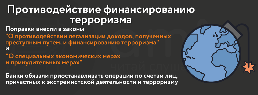 В декабре 2025 года Госдума приняла новые изменения в федеральные законы "О противодействии легализации (отмыванию) доходов, полученных преступным путем, и финансированию терроризма" и "О специальных экономических мерах и принудительных мерах". Они касаются финансирования терроризма. Закон приняли из-за случаев использования соцвыплат для финансирования терроризма. Теперь же на банки возложена обязанность приостанавливать операции по счетам лиц, причастных к экстремистской деятельности и терроризму после получения соответствующей информации от Росфинмониторинга.