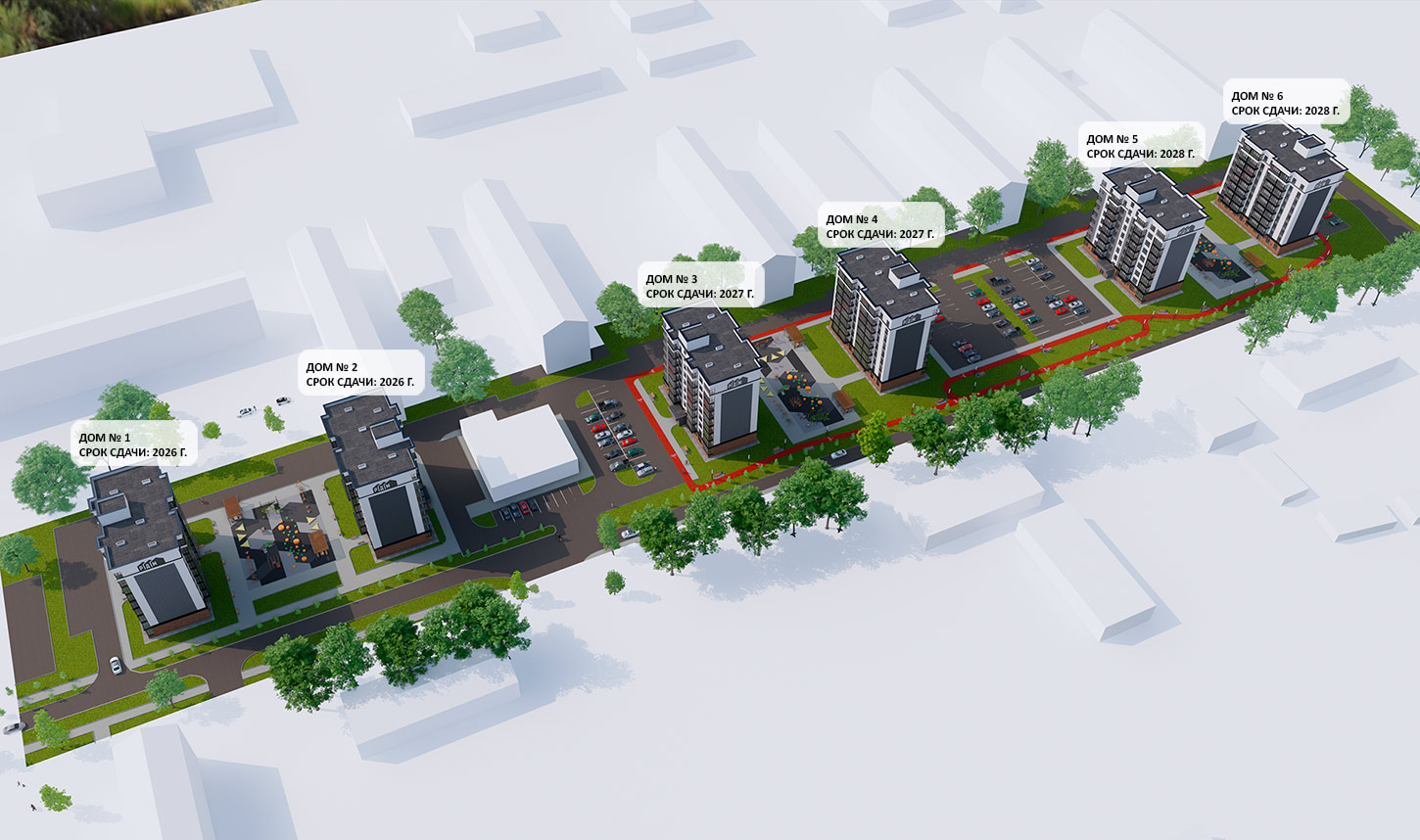 Подземных паркингов в комплексе не будет: машино-места размещены во дворах и вдоль улиц. Детские, спортивные, игровые и другие площадки предусмотрены едиными на каждые два дома.