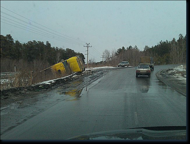 "Проживаю на Борзовой Заимке, по причине чего ежедневно проезжаю через злополучный поворот со стороны пос. Южного перед ж/д переездом. Удивляет не то, что на этом повороте очень часто происходят ДТП, а то что ГИБДД не реагирует на опасный участок и не принимает меры к установке соответствующих знаком предупреждающих о крутом повороте. Сам поворот является ловушкой для тех водителей кто ни разу не проезжал по этой дороге, так как двигаясь со стороны Южного и при свежевыпавшем снеге поворот сливается с общим фоном, а учитывая что не вписавшись в поворот автомобиль вылетает на железнодорожные пути не трудно предугадать последствия столкновения пассажирского поезда и большегрузного автомобиля, которого вы видите на снимке".