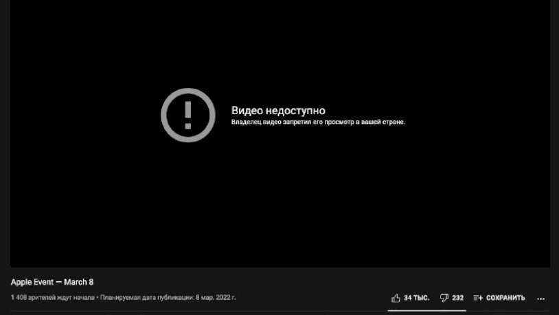 Apple отключила для российских пользователей просмотр своей весенней презентации на официальном сайте и на YouTube. На YouTube трансляция недоступна для жителей России, а на русскоязычной версии официального сайта нет даже упоминания события.