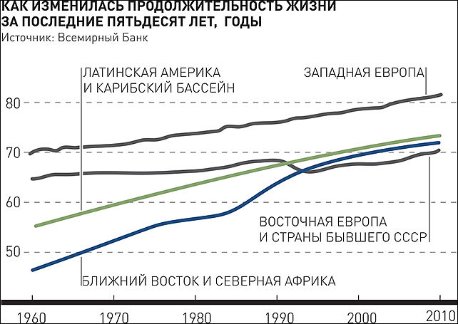 Средняя продолжительность жизни в этих странах была на 5 лет короче, чем в Западной Европе, но на 10 лет больше, чем в Латинской Америке, и на 20 лет больше, чем в Восточной Азии и на Ближнем Востоке. Сегодня картина изменилась.