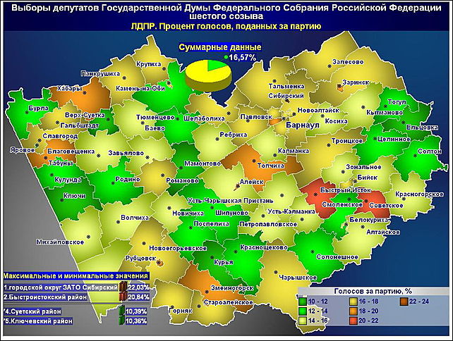 У либерал-демократов максимум в ЗАТО "Сибирский" (22,03%) и Быстроистоистокском районе (20,84%), минимум — в Суетском (10,39%) и Ключевском (10,36%) районах.