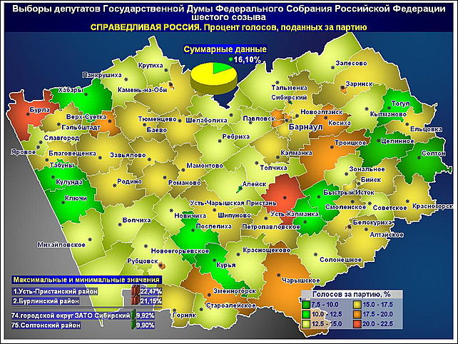 Эсеров больше всего порадовали результаты голосования в Усть-Пристанском (22,47%) и Бурлинском (21,15%) районах, огорчили — в ЗАТО "Сибирский" (9,92%) и Солтонском (9,90%) районе.