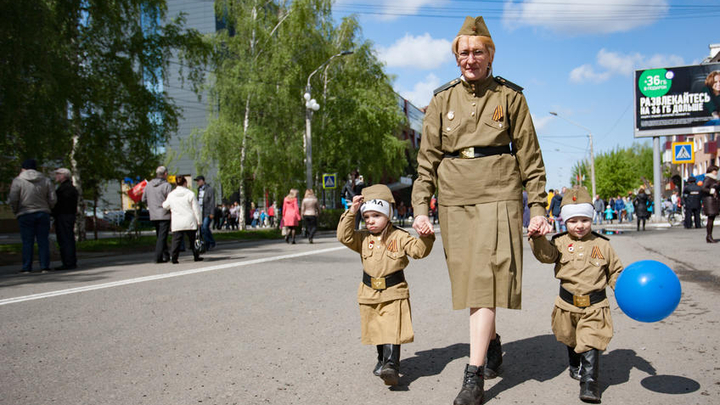 Жители Барнаула гуляли по улицам, поздравляли друг друга с праздником. Очень многие использовали военную атрибутику.