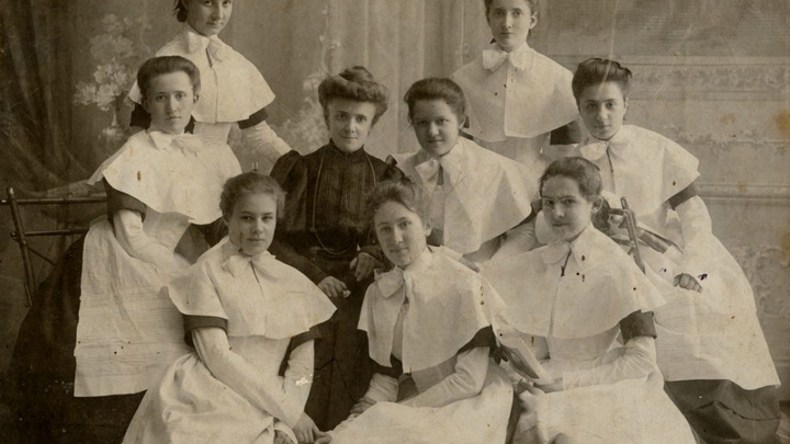 В конце XIX-начале ХХ века выпускные "подешевели". Институты благородных девиц и мужских гимназий взяли на себя большую часть затрат на проведение банкетов с музыкой. А наряды не требовались: выпускники были в ученической форме.
