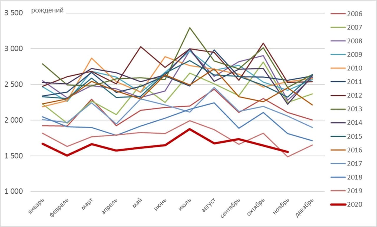 В 2019 году ни в один месяц число новорожденных в Алтайском крае не достигало двух тысяч, а в 2020 году – не приближалось к отметке 1,5 тысячи. В январе-октябре 2020 года в регионе родилось 16 604 ребенка, что на 1375 меньше, чем за тот же период прошлого года, говорится в исследовании Еремина.