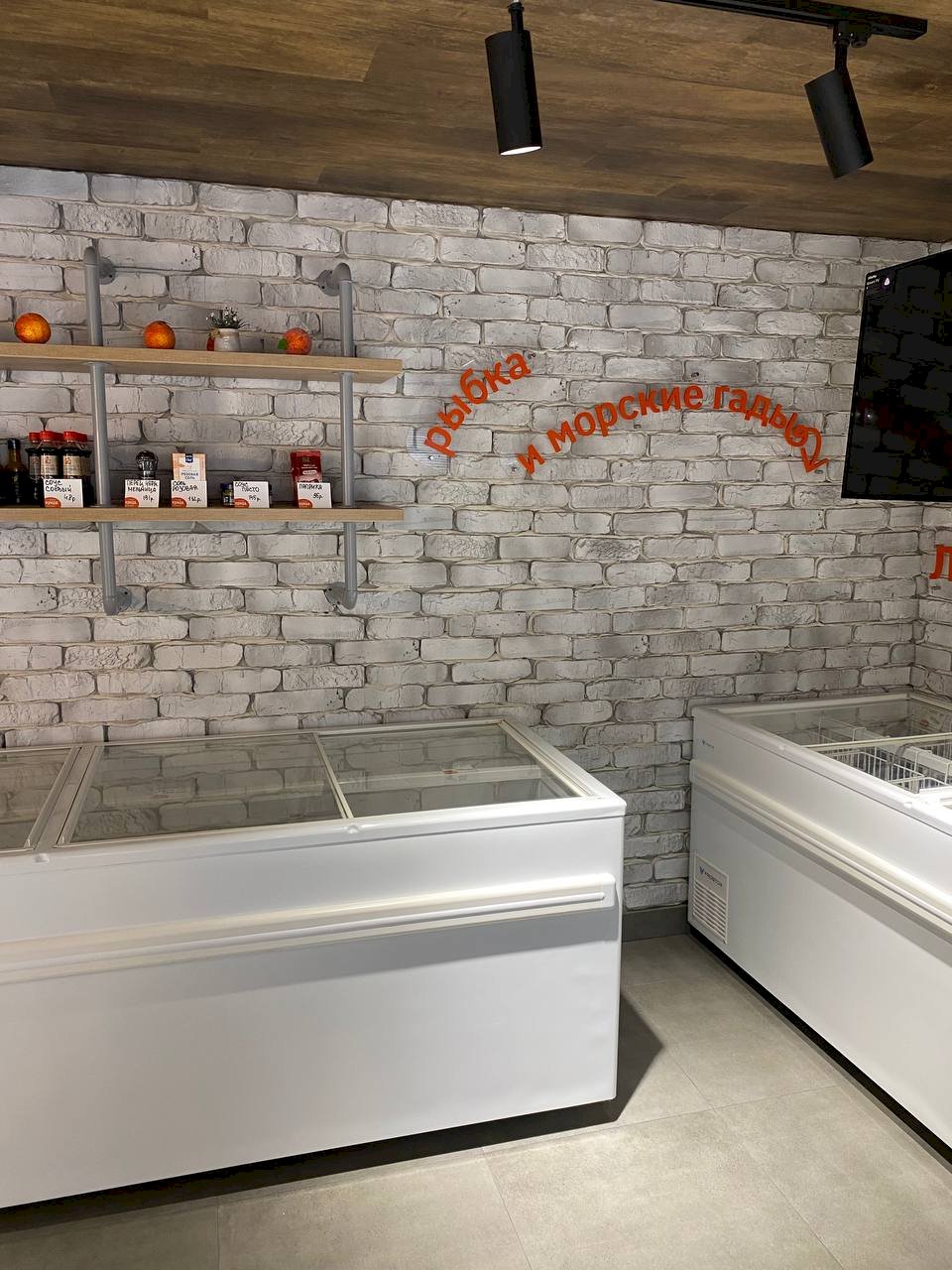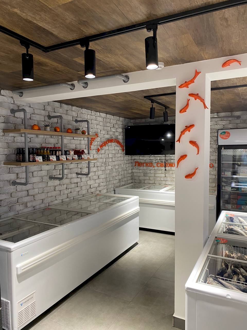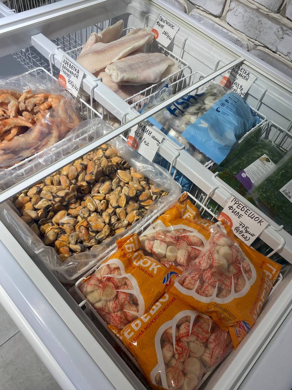 В ассортименте фреш-маркета — огромный выбор замороженной и охлаждённой рыбы и морепродуктов: лосось и тунец в тушках и стейках, скумбрия, сибас, дорадо, сельдь, нерка, окунь, треска, камбала, пангасиус, сардины, мойва и путассу, минтай и фарш минтая. Есть креветки ваннамей и котлетки из креветок, лангустины, кальмары, гребешки, мидии, осьминог, а также водоросли чука. В ассортименте также вы найдете рыбные полуфабрикаты, большой выбор рыбы холодного копчения и многое другое.