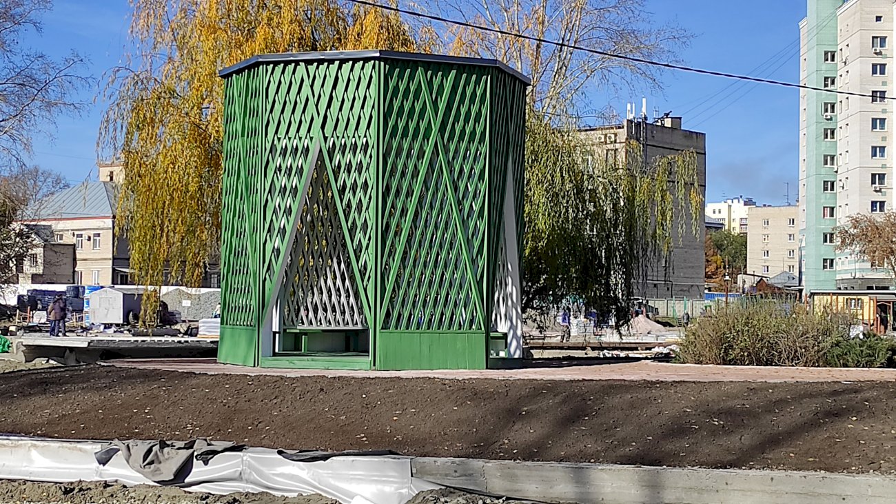 Сейчас рабочие подготавливают дно водоёма, а на острове в его центре уже появилась беседка