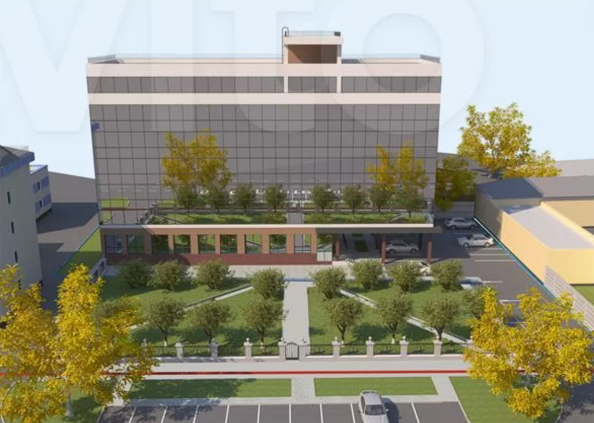 Согласно представленному в 2019 году проекту, офисник будет семиэтажным, его площадь – 4,7 тыс. квадратных метров. Особенность здания в том, что оно имеет "ножки" – колонны на уровне первого этажа, где архитекторы предусмотрели открытую парковку на 20 машино-мест. Еще 10 парковок расположат вдоль пр. Строителей.