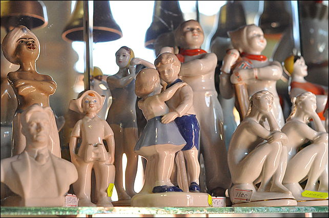 Но все же большую часть экспонатов представляют фигурки из фарфора: милые щенки, слоники, рыбки и котята – все, что при советской власти считалось явным признаком безвкусия и мещанства. По многим из них можно изучать историю. Вот, к примеру, фарфоровая узбечка, застывшая в танце, – фигурка явно 1950-х годов, являющаяся частью коллекции на тему дружбы народов, жителей советских республик.