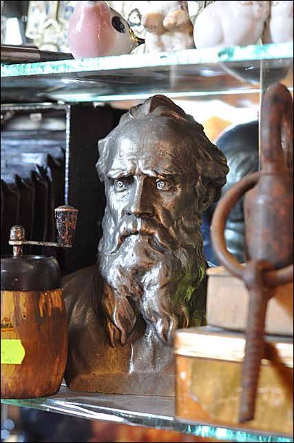 Есть здесь и барельеф (кстати, весьма искусно сделанный) Маркса, который, как выяснилось, тоже является частью серии "пламенных революционеров", среди которых – Ленин, Сталин, Володарский. Есть тут некогда ширпотребовские, а ныне – представляющие ценность бюсты Горького, Толстого, Маяковского и вечно ценное серебро – ложки с клеймами 1842 года и монограммами.