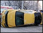 После столкновения машину занесло и опрокинуло на бок.